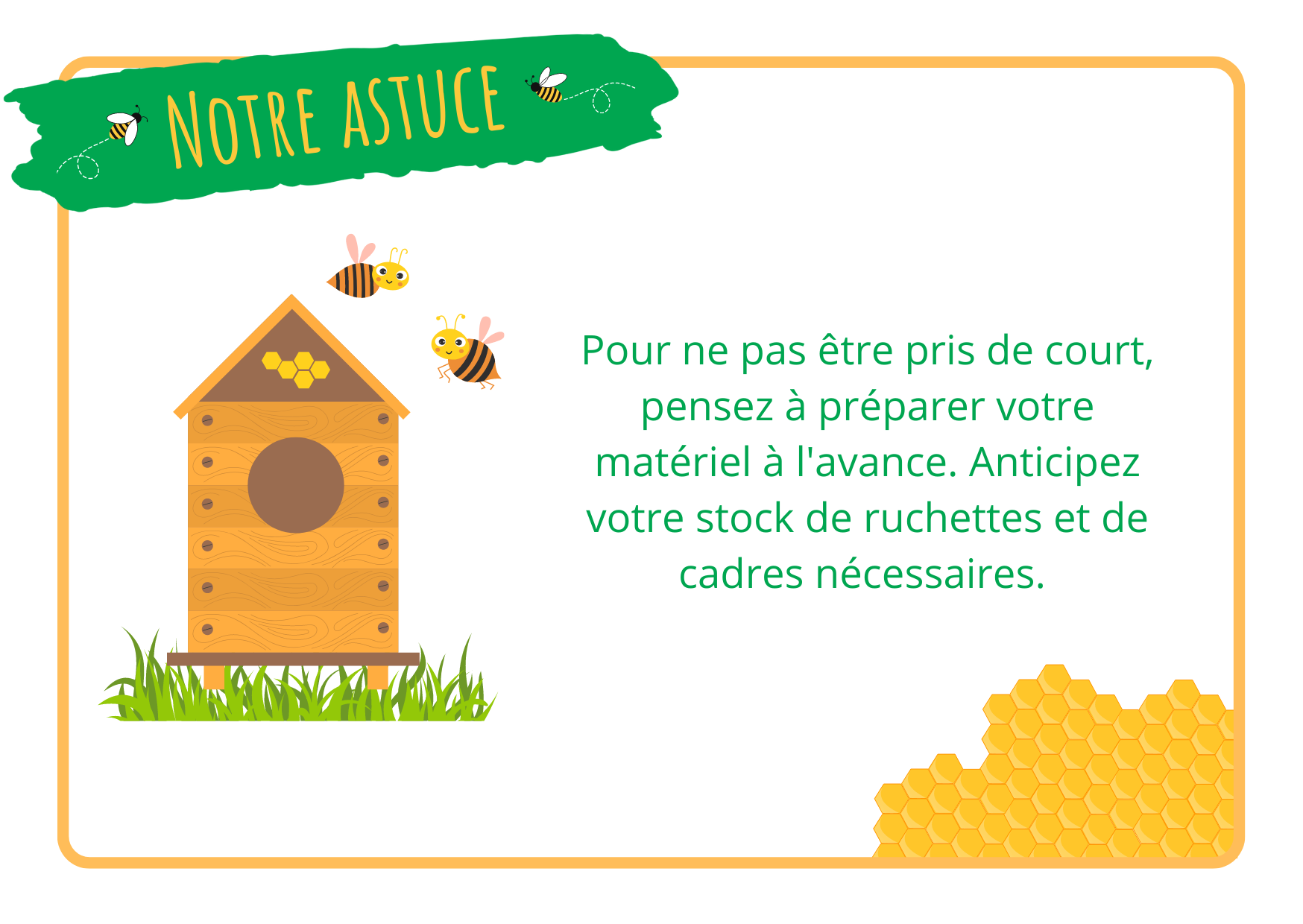 Une fois l’emplacement de votre piège choisi, placez une ruche avec à l’intérieur des cadres de cire gaufrée ou des vieux cadres bâtis. Votre ruche doit être vielle ou au moins avoir déjà servi. Si vous trouvez un essaim dans votre jardin, vous pouvez de la même manière placer une ruchette avec un cadre bâti ou faire appel à un apiculteur.